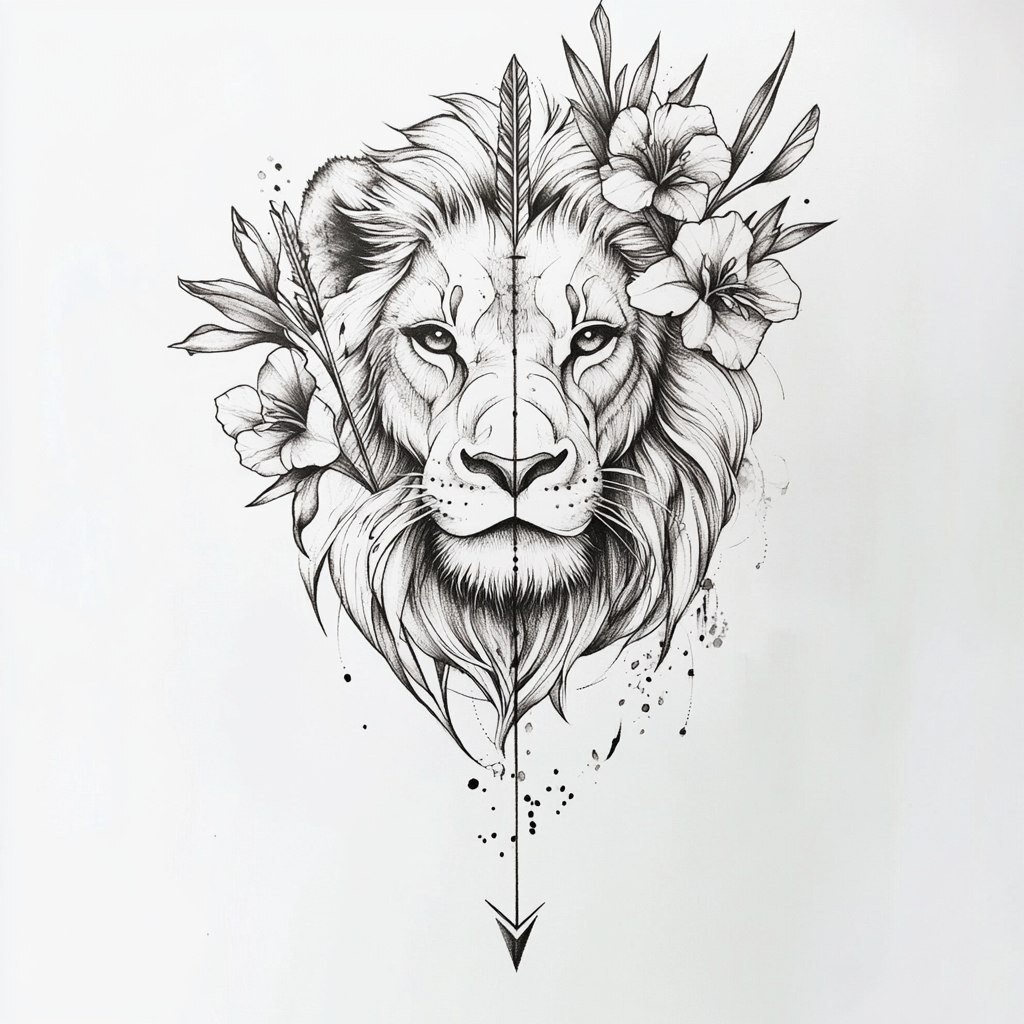 Создано на основе запроса: drawing of a half lion's head crossed by an arrow in a minimalist style with gladiolus flowers in the mane