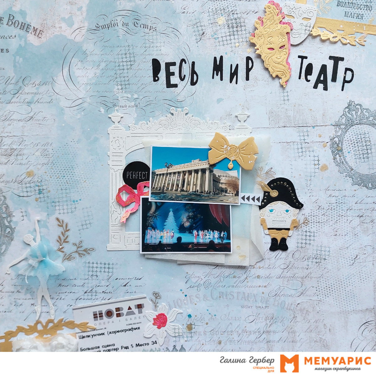 Всем привет! Сегодня покажу страничку по нашему новому скетчу #мемуарис_скетч71. Но сначала предистория. Как то я делала страничку для задания «Дорого-богато». В тот момент как раз MimiCut - товары для скрапбукинга выпустил свою серию ножей про театр. И в ту страничку бы идеально вписалась балерина, но она не успевала вовремя ко мне приехать. И вот теперь, когда я работала над скетчем, мне подумалось, что можно вернуться к той самой моей идее. И вот что у меня получилось. Скетч я повернула. В центре композиции вместо двери я разместила рамку из набора «Весь мир театр». Вместо створок дверей я разместила два горизонтальных снимка. В слои добавила кальку и кусочек фатина. Элементы со скетча, размещенные в углах странички, я заменила на разрезанную пополам рамочку, вырубленную с помощью сета «Щелкунчик». В центре композиции сам «Щелкунчик» и банты из набора «Театральная гостиная». В уголочке спряталась та самая балерина («Русские сезоны»). Я нашла место билетику. Он у меня стал вместо ж