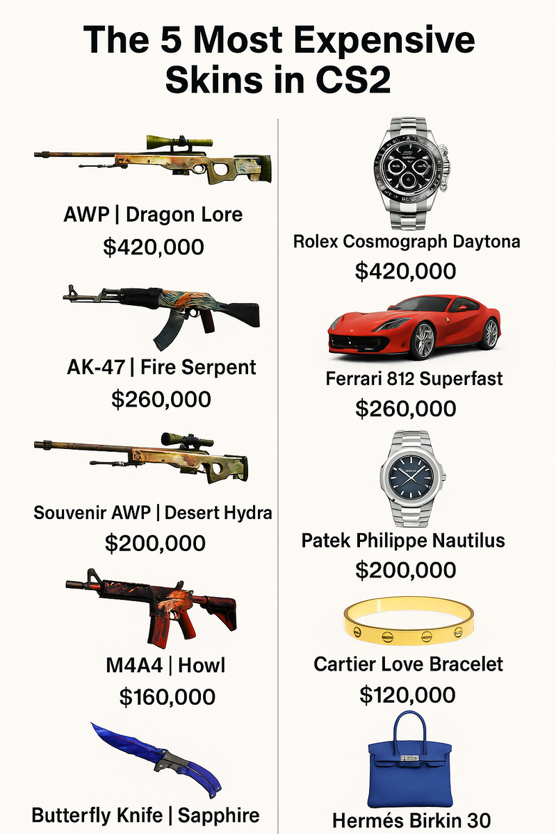 Когда-то Counter-Strike была просто игрой. Теперь это — инвестиционная площадка, рынок с миллионами оборота и арена для самых экстравагантных покупок. С выходом Counter-Strike 2, страсть к скинам достигла нового апогея, а цены на цифровое оружие заставляют задуматься: кто эти люди, что покупают пиксели за миллионы? 🤑 Цифровое безумие: от пикселя до полумиллиона долларов Самый дорогой скин в CS2 — это StatTrak™ M4A4 | Howl в качестве "Прямо с завода" с редчайшими наклейками iBUYPOWER Katowice 2014. Его цена в 2025 году превысила $500 000. И это не шутка. В этом мире ценится не только редкость скина, но и его история: участвовал ли он в турнирах, кому принадлежал, сколько в нем "киллов". Всё это превращает цифровое оружие в арт-объект, NFT и валюту одновременно. 🎯 Katowice 2014 — Грааль мира скинов Если вы хоть раз интересовались скинами, то слышали о турнире Katowice 2014. Наклейки с этого чемпионата стоят как элитный автомобиль. Почему? Это одни из первых наклеек в истории игры, и их
