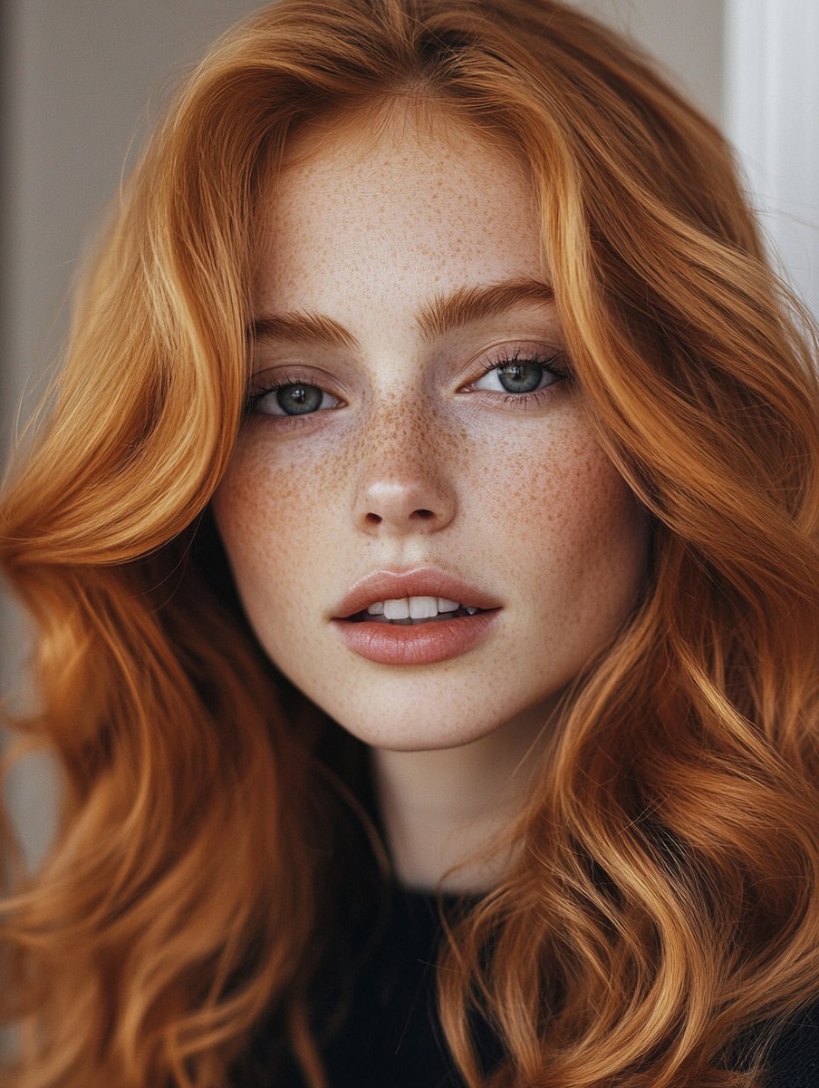 Создано на основе запроса: Nordic Ginger Natural bright copper hair, medium-long loose waves, soft freckles, light hazel eyes, natural