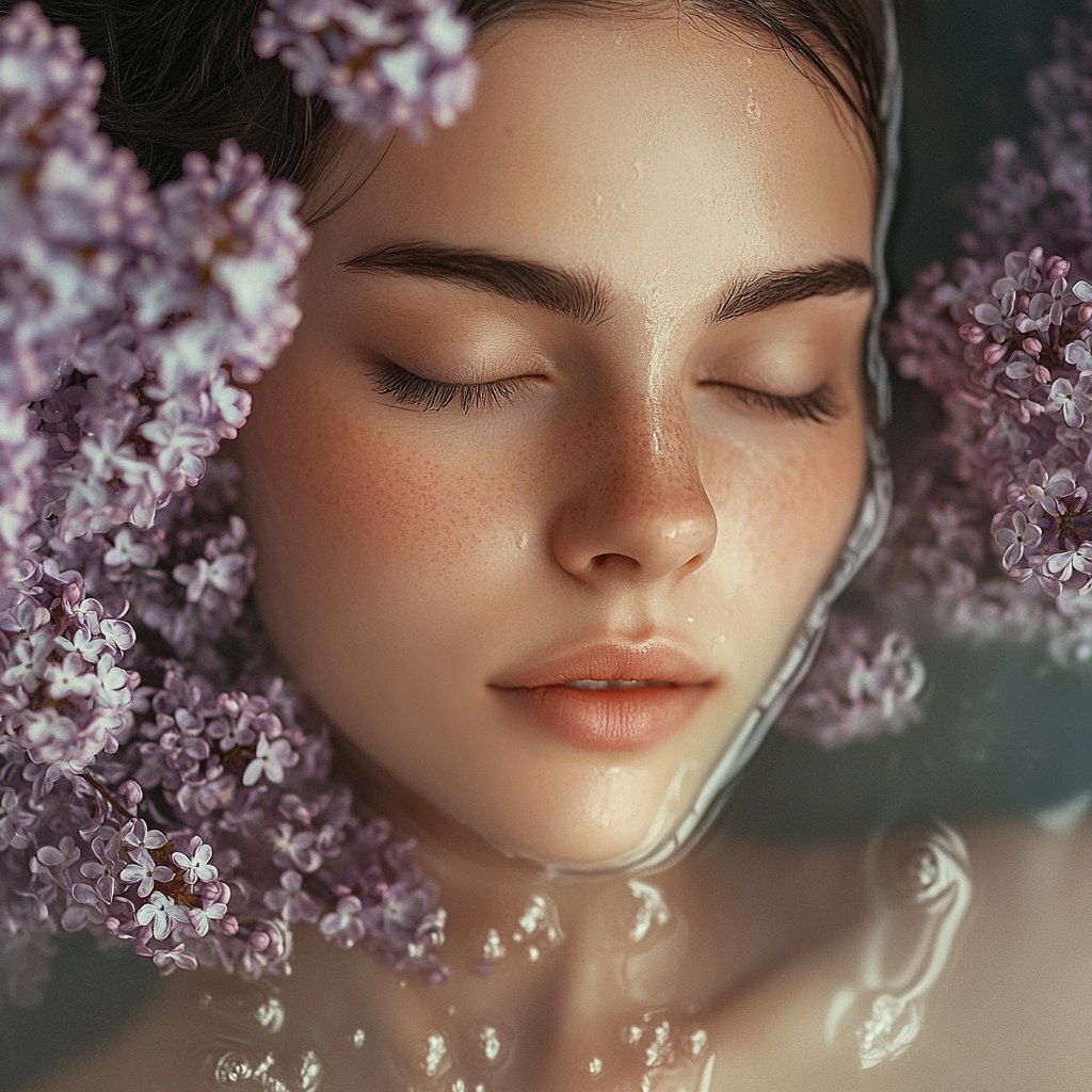 Создано на основе запроса: realistic image of a woman in a spa,a few lilac flowers, relaxing mood, minimal atmospheric, creative photography