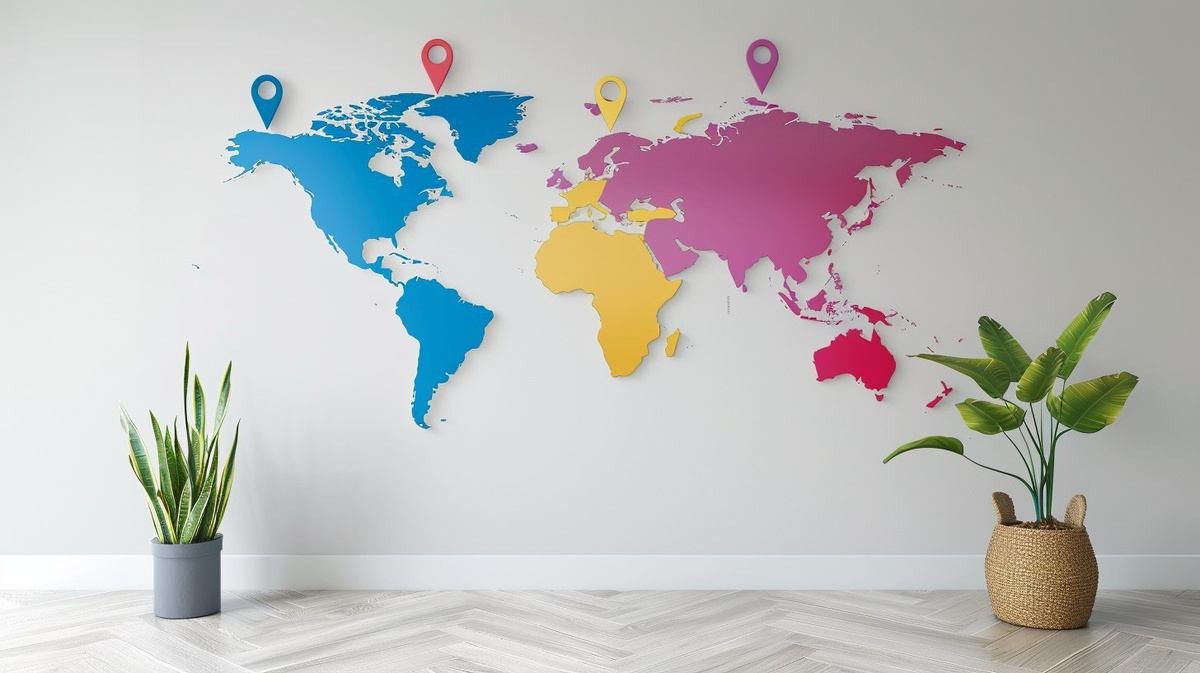 Создано на основе запроса: Realistic world map on a clean white wall, colorful location markers, bright studio light, minimalistic style