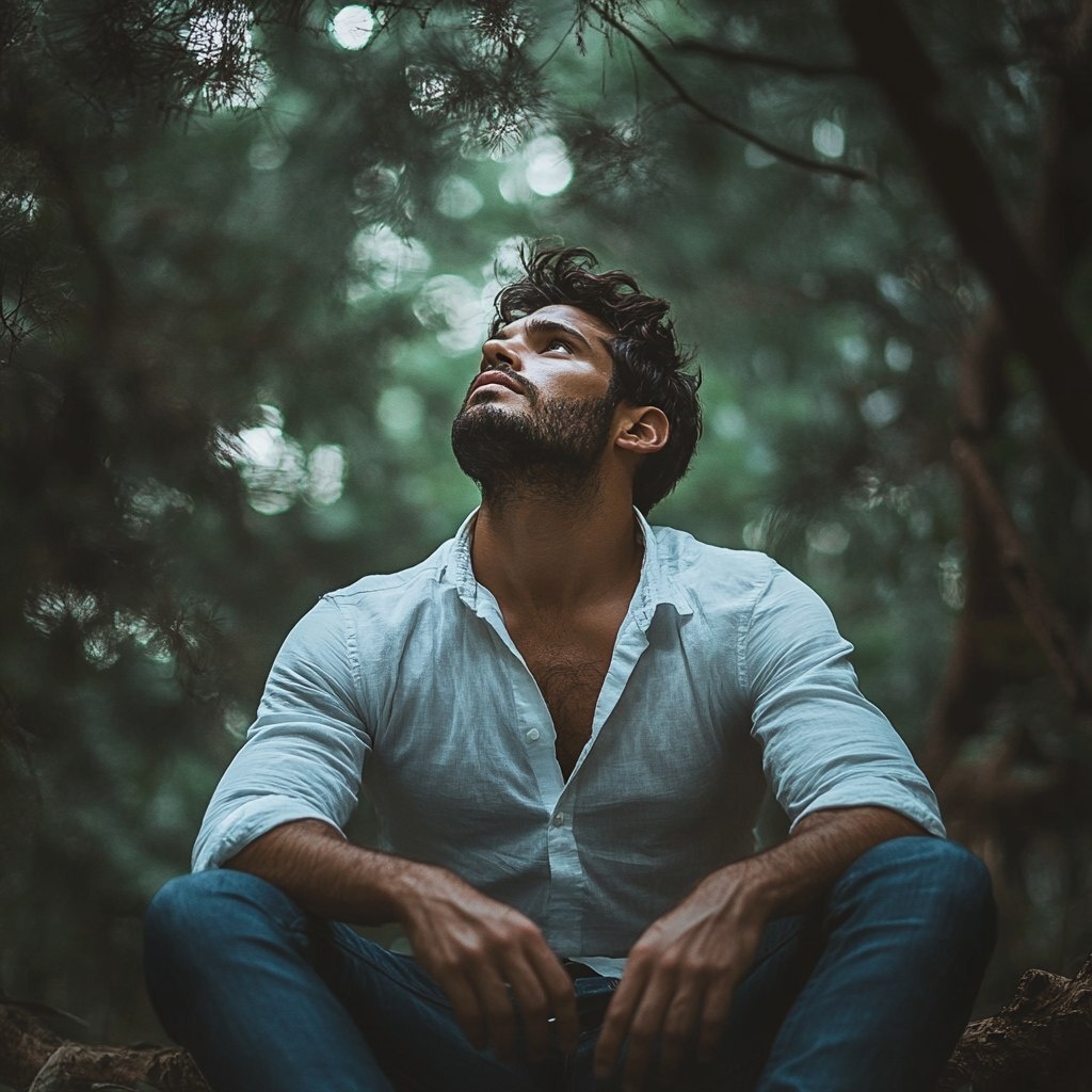Создано на основе запроса: realistic image of a man on pose, wearing white shirt and blue jean pant, in a forest, minimal atmospheric