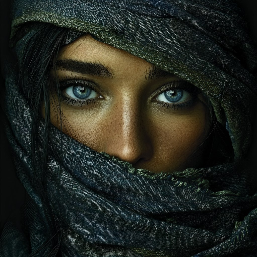 Создано на основе запроса: Abeautiful youg Persian woman, covered with a scarf - so only her eyes are visible