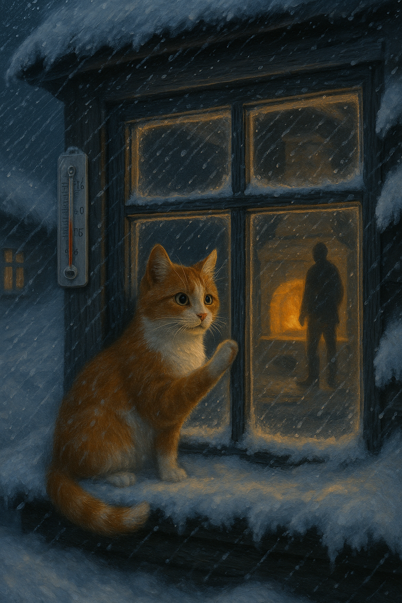 Есть зимние вечера, которые не отпускают из сердца, даже спустя годы. В тот морозный день — было слишком холодно на улице, — я сидел у русской печки, слушал, как трещат поленья, и думал, что всё самое важное в этом мире уже рядом. И вдруг... стук в окно. Я поднялся, подошёл, прищурился в темноту — пусто. Тяжёлый холод прилипал к стеклу снаружи, как немая угроза. Я пожал плечами и вернулся к теплу и уюту, но через минуту вновь — стук. Такой, будто кто-то кидал снежки с улицы. На этот раз, когда я открыл занавеску, моё сердце сжалось: на подоконнике сидела крошечная рыжая кошка — белые лапки, белая мордочка, глаза как две свечки в ночи. Она не плакала, не царапалась — просто смотрела. Я открыл окно. Без лишних церемоний, как будто она была дома всегда, кошка прыгнула внутрь, растянулась на тёплом полу, закрыла глаза и заурчала. Всем своим существом она говорила: "Человек, здесь тепло. Человек, можно я останусь?" Позже бабушка призналась: осенью она жалела бездомных котов и оставляла им