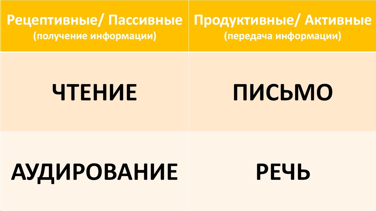 Навыки бывают активные и пассивные (или рецептивные и продуктивные). Пассивные: чтение и аудирование (когда мы информацию в себя загружаем); активные: письмо и речь, когда мы сами становимся источником информации и должны ее воспроизводить.