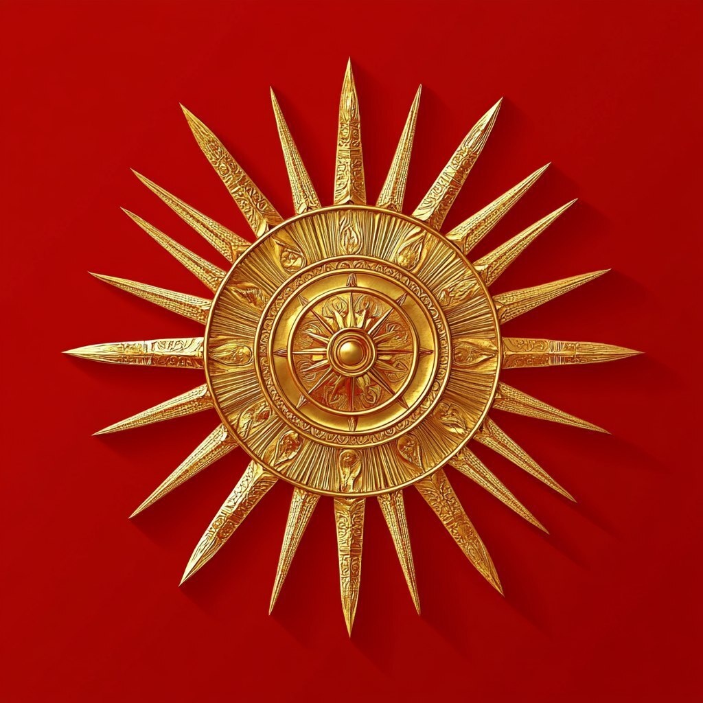 Создано на основе запроса: Create a powerful emblem: a golden sun with multiple stylized radial rays in a circular pattern, placed on a