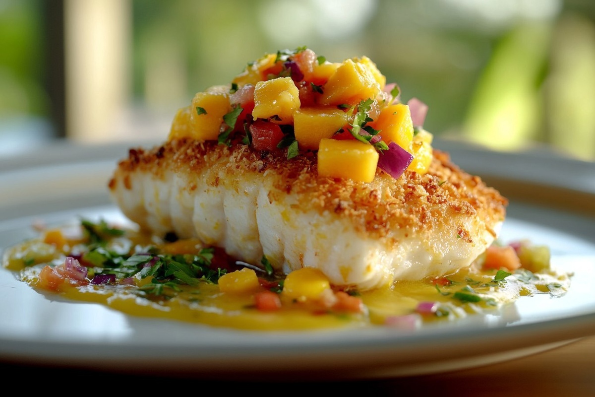 Создано на основе запроса: Title: Coconut Crusted Fish with Mango Salsa | STYLE: Close-up Shot right view | EMOTION: realistic as possible