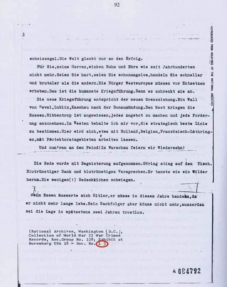 Историк и политический аналитик из Нью-Йорка доктор Роберт Джон нашел документальные подтверждения высказывания Адольфа Гитлера " Кто сегодня помнит об уничтожении армян ? ". Доктор Джон обнаружил оригинал документа в военном отделении Национального Архива США. Цитата гласит: "Наша сила в нашем натиске и нашем зверстве... Кто помнит сегодня об уничтожении армян?...". Документ, найденный американским ученым, свидетельствует о том, что приведенное выше заявление было сделано Гитлером на совещании высшего командования рейха, которое проходило в Оберзальцберге 22 августа 1939 года. Документ хранится в Национальном архиве Вашингтона. Касаемо данного документа и цитаты " Кто сегодня помнит об уничтожении армян ? " Полный текст на русском языке «Кто же сегодня говорит об уничтожении армян?» [22 августа 1939 г.] Мое решение напасть на Польшу было принято прошлой весной. Первоначально я опасался, что политическая констелляция заставит меня нанести удар одновременно по Англии, России,