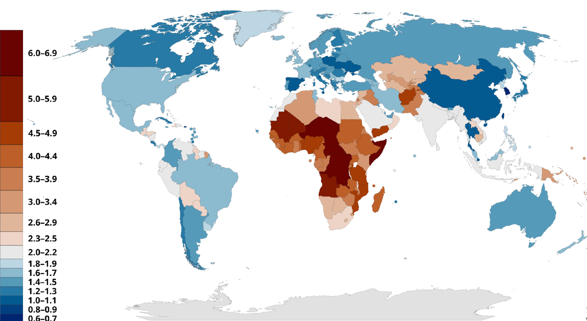 Опять про демографию. Очень мне понравилась эта карта — все чересчур наглядно и доходчиво. Сразу скажу данные на 2022 год, но не думаю, что за пару лет в тенденции рождаемости по странам что-то кардинально поменялось.