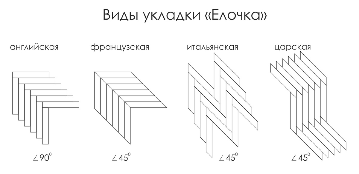 Укладка елочкой популярный вид для укладки напольного покрытия. Причем сейчас с появлением клеевого кварцвинила реализовать такой вариант стало проще. Но если вы думали, что раскладка елочкой - это только один вид, то вот вам еще варианты: английская елочка французская елочка итальянская елочка царская елочка Для французской, итальянской и царской елки нужны ламели с углом под 45 градусов. Они еще называются шевроны. Такие варианты есть и в ламинате и в плитке. А можно разойтись и сделать Версальскую раскладку или выбрать готовые плиты ламината с таким рисунком Главное, что раскладка "елочка" - это не одна елка в центре ). Будьте внимательны!