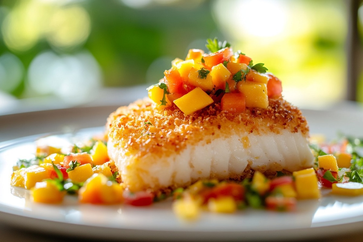 Создано на основе запроса: Title: Coconut Crusted Fish with Mango Salsa | STYLE: Close-up Shot right view | EMOTION: realistic as possible