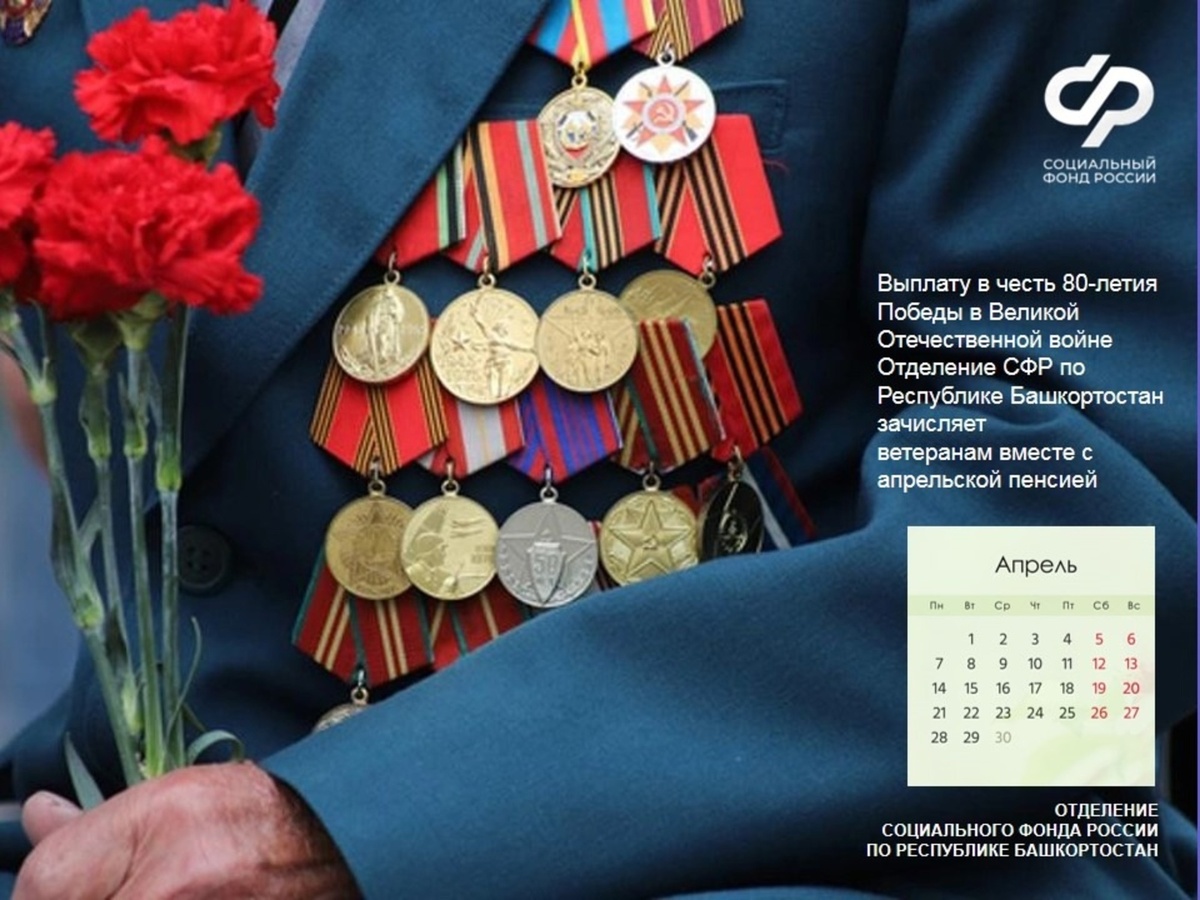 В апреле Отделение Социального фонда России по РБ осуществляет единовременные выплаты ветеранам в честь 80-летия Дня Победы, которые доставляются вместе с пенсией. Об этом сообщили в пресс-службе ведомства. Размер юбилейной выплаты составляет 80 тысяч рублей. Её получатели - участники и инвалиды Великой Отечественной войны, а также вдовы участников войны, награждённые знаками «Житель блокадного Ленинграда», «Житель осаждённого Севастополя» и «Житель осаждённого Сталинграда». Кроме того, выплату получают бывшие несовершеннолетние узники концлагерей. Труженики тыла, которые работали в период ВОВ не менее шести месяцев, за исключением работы на временно оккупированных территориях СССР, а также награждённые орденами или медалями СССР за самоотверженный труд в годы войны и бывшие совершеннолетние узники концлагерей, получат 55 тысяч рублей. Кроме того, участники и инвалиды Великой Отечественной войны получат ежегодную выплату в размере 10 тысяч рублей ко Дню Победы. Дополнительную информаци