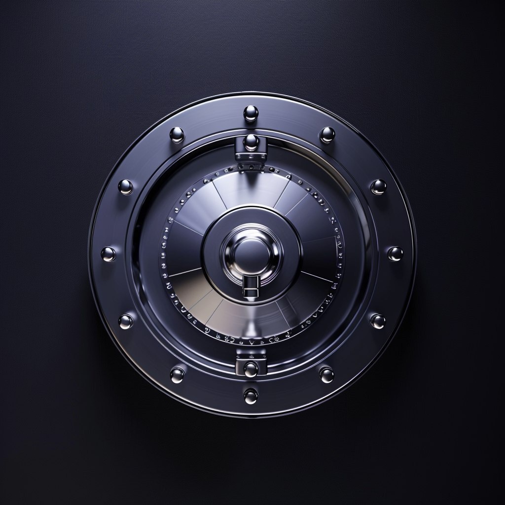 Создано на основе запроса: Top-down view of a sleek metallic safe vault door, illuminated softly against a dark minimalist background