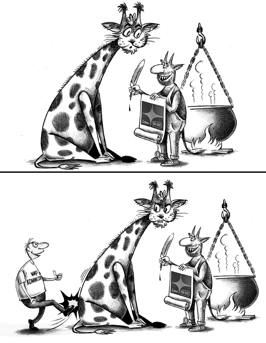 Как только в блоге «Мир комиксов» набралось 100 тысяч подписчиков, мир слегка качнулся. Не потому что это такое невероятное событие — а потому что сам «Мир комиксов» начал ходить подбоченившись, важно задрав нос и чуть ли не спотыкаясь о собственную самооценку. Дзен прислал ему награду — блестящую, тяжёленькую, с поздравлениями. И он побежал её всем показывать, напевая что-то вроде «мы этого достойны». И в этот момент наши художники сделали то, что умеют лучше всего — выдали нам правду. Через рисунки, конечно. Потому что словами такое лучше не говорить — обидно же. Одним из первых отозвался Сергей Корсун. Его взгляд на «кнопки за достижения» оказался предельно честным: без сделки с дьяволом такую штуку не получишь. Андрей Захаров вообще не стал мелочиться — скинул сразу три комикса. Получилась мини-история, в которой раскрывается кто на самом деле заслужил награду. Евгений Гречко тоже подключился мгновенно. И намекнул, кто кое кому пора легонько дать по хребту чтобы не зазнавался. Л