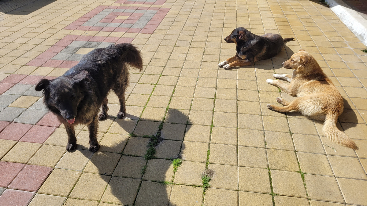 Когда ходили в населенный пункт, на улице увидели трех собак, одна из которых была очень похожа на Догикоина.
