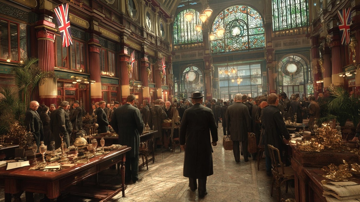 Создано на основе запроса: A symbolic interior view of a 19th-century London stock exchange, crowded with traders in formal attire