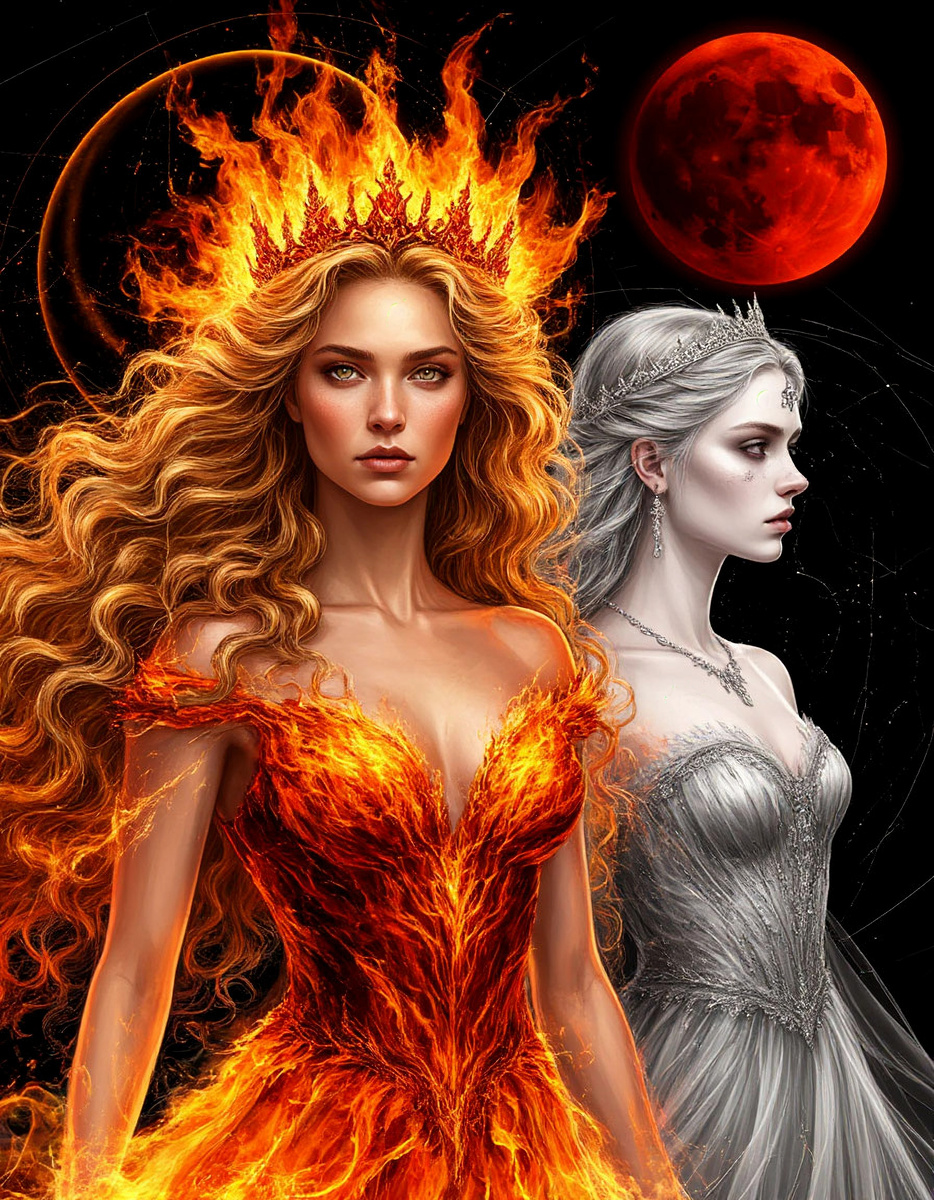 Тема небесных светил меня всегда интересовала. Идея хуманизации солнца и луны уже давно поселилась у меня в голове и вот наконец-то я взялась за генерацию. Использовала нейросеть Шедеврум. Вот они две сестры. Золотоволосая в огненной короне - Солнце, тонкокостная и бледная с серебряными волосами - Луна. Обе они периодично закрывают друг друга и становятся причинами затмений. Вот она Луна поближе. Красивая, но с темной стороной. Так я хотела передать "Красную Луну". Лунное затмение, когда ночная сестра ненадолго обретает наряд дневной сестры. Серебряную принцессу охватил солнечный огонь. Другой вариант Лунного затмения. Более жутковатый. Одна из зарисовок полнолуния. В более холодном и мрачно мистическом стиле. И вот такой вариант Полнолуния. Даже не знаю какой мне нравится больше. Растущая Луна. Румяная и набирающая силы. "Стареющая Луна" или умирающая. Силы стали покидать сестру, скоро она исчезнет. "Новолуния" Луна исчезла из поля зрения людей, но она все еще там, на небе. Тем