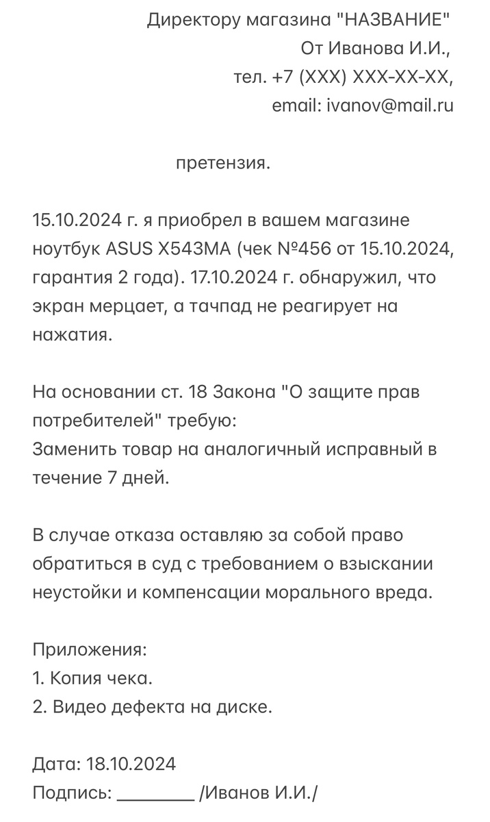 Претензия – официальный документ, который нужно правильно оформить, чтобы продавец (исполнитель) не смог проигнорировать ваши требования. 📝 Обязательные элементы претензии 1. Реквизиты сторон - Кому: Название организации, ФИО руководителя (если известно), юридический адрес. - От кого: Ваши ФИО, контакты (телефон, email, адрес). 2. Описание ситуации - Дата и место покупки/оказания услуги (номер чека, договора). - Товар/услуга: Название, модель, артикул, срок гарантии (если есть). - Суть проблемы: Подробно описать дефект, нарушение сроков, несоответствие описанию. 3. Требования Выберите одно из требований (по ст. 18 ЗоЗПП для товаров, ст. 29 ЗоЗПП для услуг): Для товара: - Замена на аналогичный. - Бесплатный ремонт. - Возврат денег. - Уменьшение цены с учетом недостатка. Для услуги: - Безвозмездное устранение недостатков. - Повторное оказание услуги. - Возврат уплаченной суммы. 4. Сроки исполнения - 10 дней – на возврат денег за товар (ст. 22 ЗоЗПП). - 7 дней