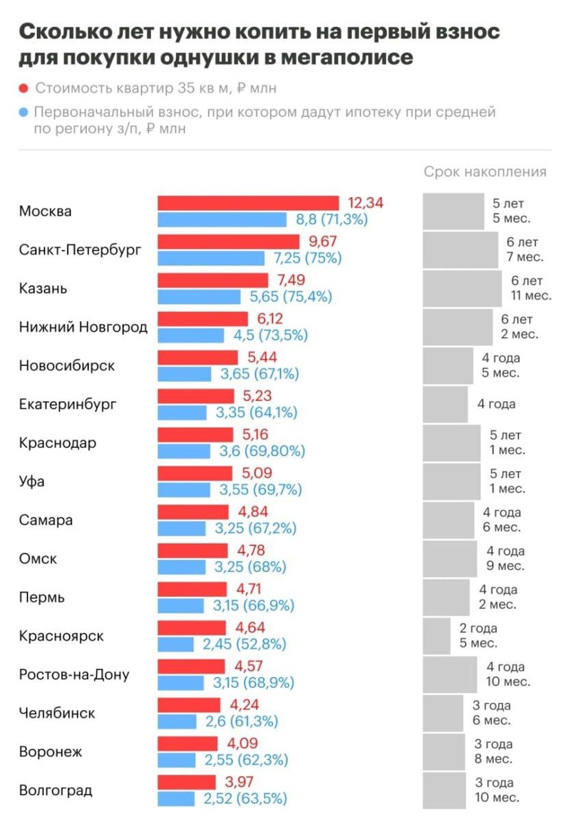 Первоначальный взнос по ипотечным кредитам в России уже составляет 75% от стоимости жилья, согласно данным СМИ. В Санкт-Петербурге, чтобы накопить такую сумму на покупку однокомнатной квартиры, потребуется прожить без еды и воды целых 6 лет и 7 месяцев. 👉 Ядро событий 18+🔥