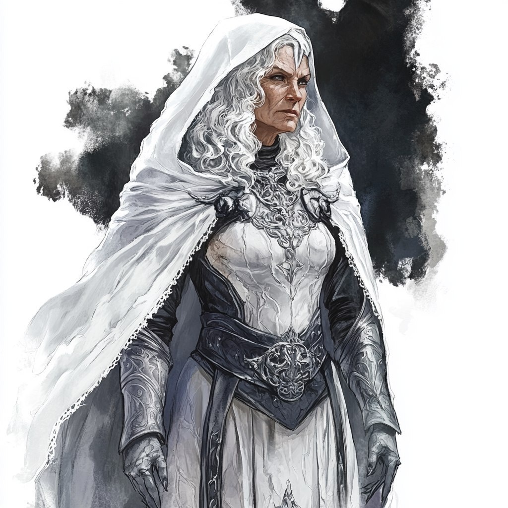 Создано на основе запроса: D&D character, D&D illustration style, dark watercolor style, old elderly human female death domain cleric, white marble like armor with silver colored gothic decorations, with a white veil on her head, silvery curly long hair, holding necrotic power, --- Автоперевод: Персонаж D & D, стиль иллюстрации D & D, темный акварельный стиль, старый пожилой мужскую женскую область смерти, белый мрамор, похожий на броню с готическими украшениями с серебряным цветом, с белой вуалью на голове, серебристые вьющиеся длинные волосы, держащие некротическую силу, некротическая сила, Хорошо вышло? 🤔 https://dzen.ru/id/65c0c65c86e4f837c27b24d7 #ИИ #AI #нейросеть #midjourney #art