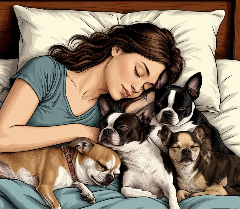 Вы когда-нибудь спали с собакой? Нет-нет, не просто впустили в кровать. А именно спали, когда вокруг тебя — не один, не два, а целая стая хвостатых товарищей, у каждого — свой ритм дыхания, своё представление о пространстве, и, конечно… свой уникальный стиль храпа. Добро пожаловать в мою реальность. Итак, знакомьтесь: Ночной Оркестр “ЧихоБостонская симфония”. Дирижёр — я. По принуждению. Солисты — мои любимые: Томми, Ева и два бостона Жанни и Фифа. 🎺 Первая скрипка — Томми. Он маленький, но очень амбициозный. Когда он спит — он захватывает максимум пространства. То лапку вытянет на подушку, то носом под бочок упрётся, то хвостом прямо в лицо. Но самое главное — храп. Удивительно, как из такого малыша может доноситься такой богатый звук. Где-то между старым мотоциклом и лёгким сопением младенца. Но только когда ты вот-вот засыпаешь — БАЦ! — резкий “бзззррр”. Иногда я пугаюсь. Иногда смеюсь. Иногда просто сдаюсь и ложусь на край. 🎷 Вторая скрипка — Ева. Ах, Ева. Она — леди. Она спит