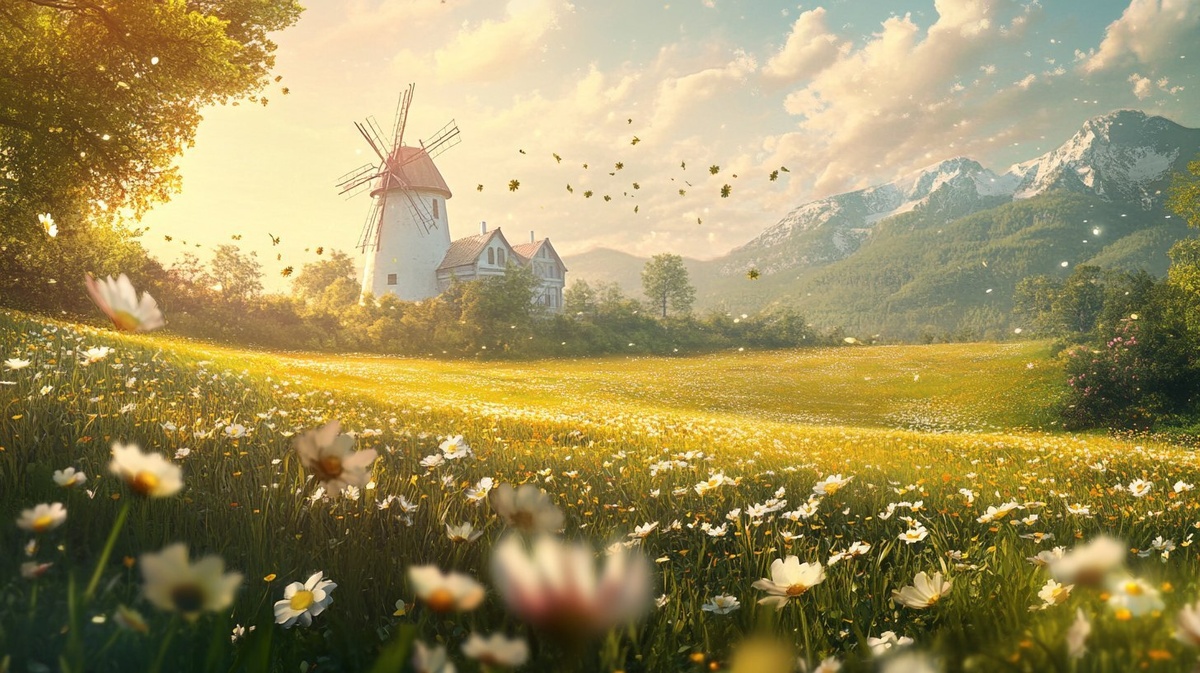 Создано на основе запроса: an illustration of an magical field landscape from dnd, with a magical white mill in the background, we can see some scarecrow in the field, flowers petal effect flying in the air, spring, beauty of nature, nice sun effect