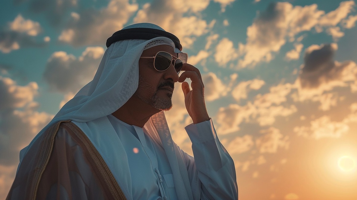 Создано на основе запроса: An Arab man wearing traditional Gulf attire (white kandura, black agal, white ghutra), adjusting his ghutra with one hand, sunglasses on, stylish modern look, dramatic sunset sky background with sun rays piercing through thick clouds, cinematic lighting, realistic photography, soft shadows, --- Автоперевод: Арабский человек, носящий традиционный наряд залива (белый кандура, черный агал, белая гатра), приспосабливая свою гутру одной рукой, солнцезащитные очки, стильный современный вид, драматический солнечный фон неба с солнечными лучами, пронзившимися сквозь густые облака, кинематографическое освещение, реалистичная фотография, мягкие тени, мягкие тени, мягкие тени, мягкие тени, мягкие тени, мягкие тени, мягкие тени, мягкие тени, мягкие тени, мягкие тени, мягкие тени, мягкие тени, мягкие. Как тебе такое изображение? 🤔 https://dzen.ru/id/65c0c65c86e4f837c27b24d7 #ИИ #AI #нейросеть #midjourney #art