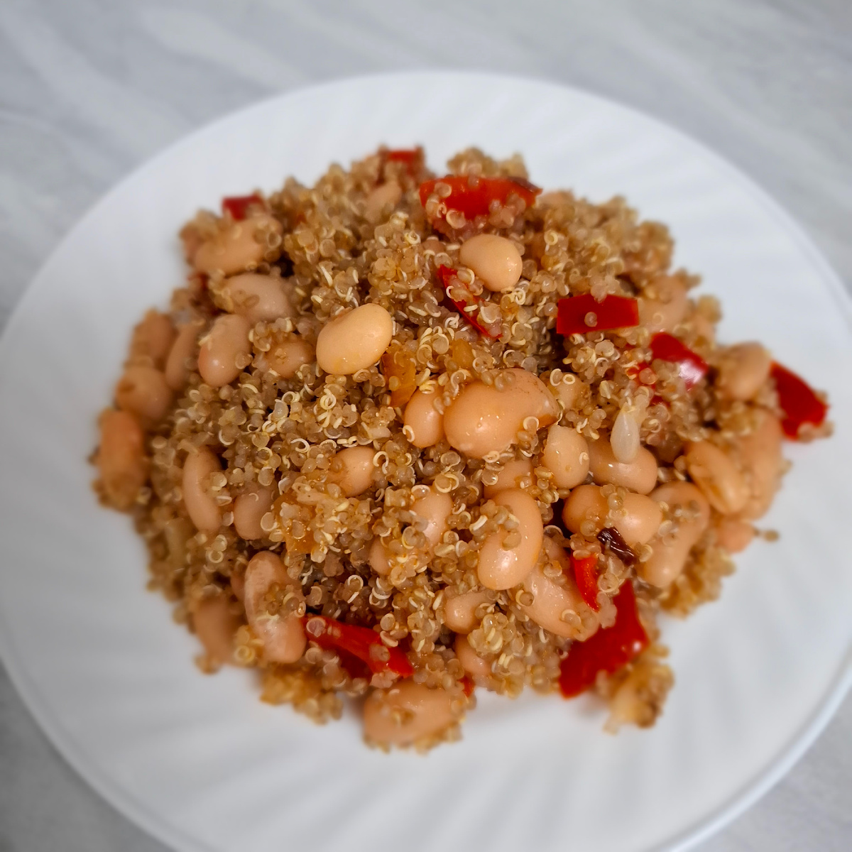 Когда киноа свариться, промываем и закидываем к луку с перцем. Добавляем консервированную фасоль, мелко нарезанный томат, солим, перчим по вкусу и пассируем пару минут.