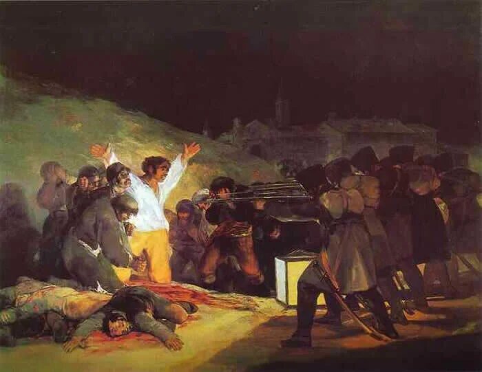 В общем, стиль творца начал резко меняться. Французское же вторжение оставило глубочайший след в сознании Гойи. Именно после его окончания он написал показанную в самом начале поста работу - "Третье мая 1808 года в Мадриде", посвящённую подавлению восстания, которое начало герилью.
