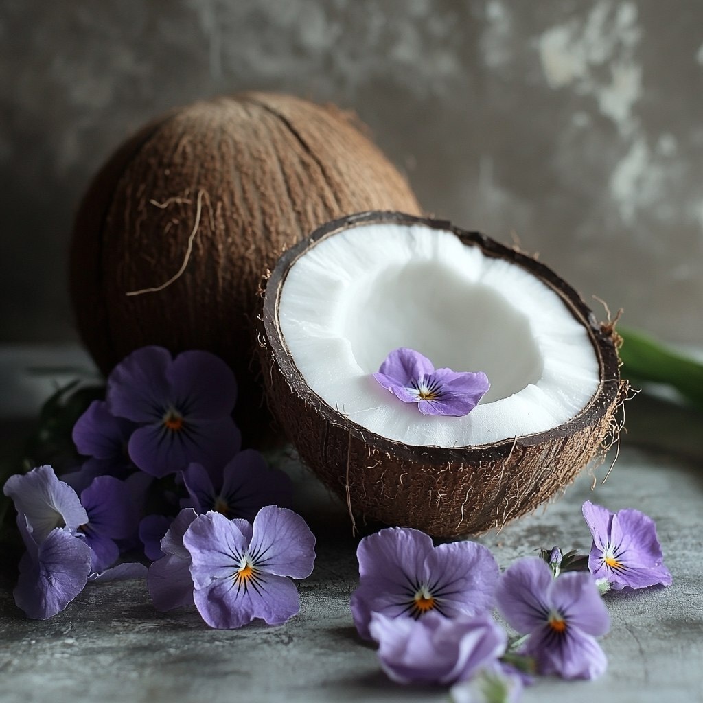 Создано на основе запроса: realistic image of coconut and violets, in a creative combo, atmospheric and minimal photography