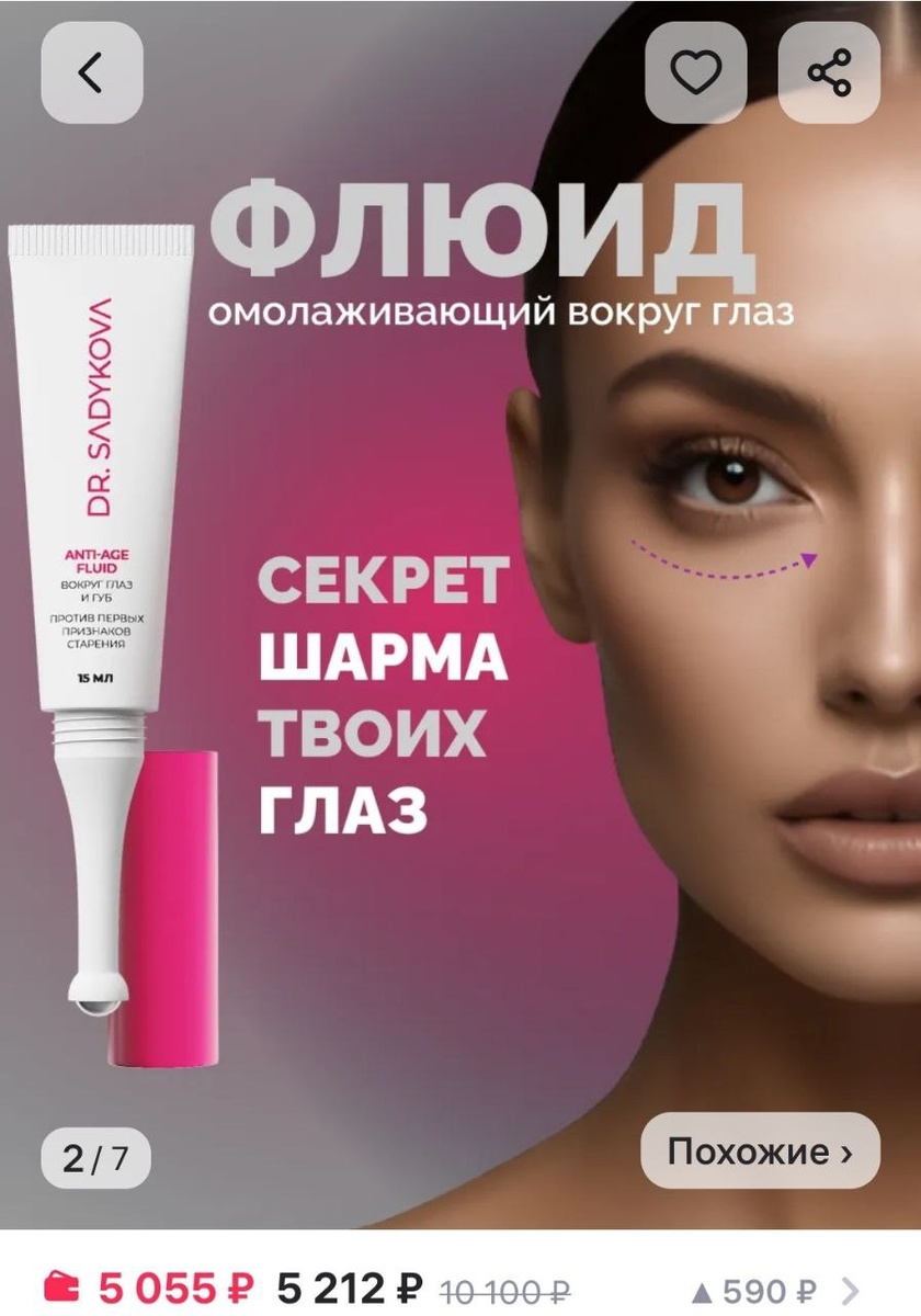 Разбор карточки флюида для кожи вокруг глаз Общее впечатление: Есть базовые элементы оформления, но много недоработок, которые мешают карточке продавать продукт за 5000₽. Ниже — подробный разбор по блокам. --- 1. Видео-презентация 🎥 Плюсы: ✔️ Есть видео — уже повышает вовлечённость и конверсию. Что доработать: На уровне ощущений хочется видеть другую модель. Интуитивно кажется, что другая энергетика девушки дала бы лучшее попадание в целевую аудиторию. Подобрать образ ближе к ЦА: ухоженная, естественная красота 30+. Нейромаркетинг: Покупатель идентифицирует себя с героем видео. Если модель "не откликается" — доверие к продукту резко снижается. Рекомендация: Тестировать другое видео с новой моделью для усиления эмоционального отклика. --- 2. Оценка товара ⭐ Проблема: Текущий рейтинг 4.4 при цене 5000₽ — очень низкий. При выборе дорогих товаров покупатели отсеивают карточки с рейтингом ниже 4.7 ещё до просмотра. Нейромаркетинг: Низкий рейтинг = внутренний "триггер опаснос
