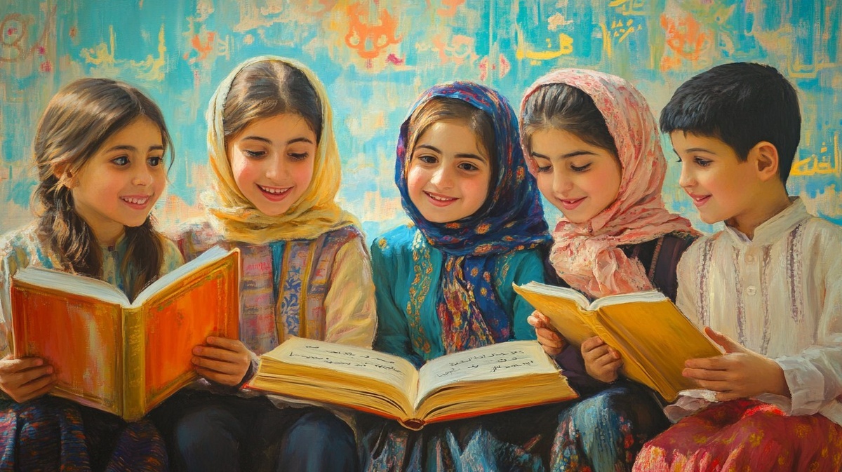 Создано на основе запроса: Group of happy Iranian children, 6-8 years old, studying together, one holding a Persian book, one holding an
