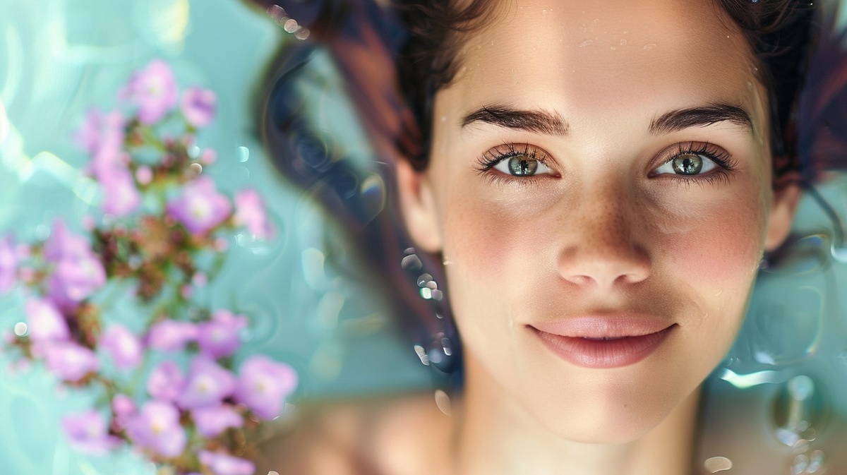 Создано на основе запроса: realistic image of a woman in a spa, looking at camera, smiling, relaxing mood, a few purple little flowers, in a