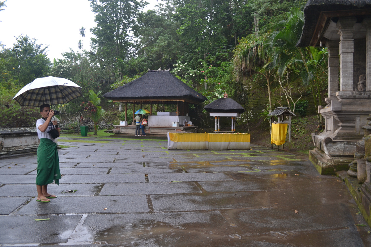 Дождик не прекращался,но мы продолжали кататься по интересным местам.Мы же питерские и дождём нас не напугаешь! Приехали мы в древнейшую пещеру Гоа Гаджа(примерно 9-11 век).Гоа по-индонезийски это пещера,а Гаджа-слон.По одной из версий пещеру назвали так в честь индуистского бога Ганеши,у которого голова слона.Открыли эту пещеру голландские колонизаторы в 1923 г. Чтобы попасть в пещеру придётся спуститься по лесенке.А уже на территории надеть саронги!В этот раз они были бордового цвета. Пещера высечена в скальном массиве,а над входом в неё изображение мифического существа,от которого в ужасе разбегались люди и животные.Некоторые считали что это Дух Леса.Ещё по одной версии-это мифическое существо,которое забирает плохие мысли у входящих в пещеру.У меня ,увы,мысли не забрал.Иногда,нет-нет да и лезет в голову всякая чушь! Внутри в стенах вырублено 15 ниш.Они были сделаны для медитаций.Местные жители и сейчас приходят сюда медитировать.В пещере есть три лингама Шивы и считается