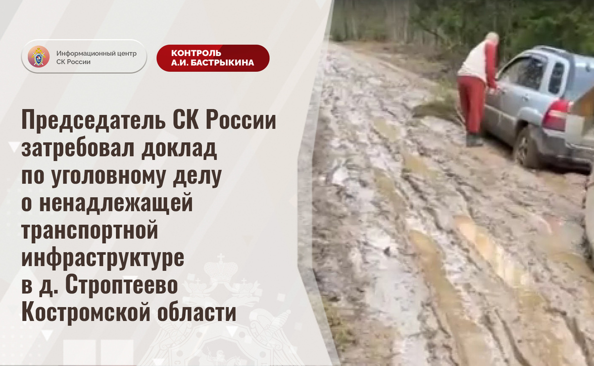 Председатель СК России затребовал доклад по уголовному делу о ненадлежащей транспортной инфраструктуре в д. Стропеево Костромской области В СУ СК России по Костромской области расследуется уголовное дело по признакам преступления, предусмотренного ст. 293 УК РФ (халатность). По данным следствия, в деревне Стропеево единственная дорога, ведущая к частным домовладениям двух семей, находится в непригодном состоянии. В период осадков дорожное полотно размывает, в результате чего проезд личных автомобилей и транспорта экстренных служб затруднен. Несмотря на решение суда о возложении на администрацию обязанности проведения ремонтных работ, до настоящего времени оно не исполнено. Многочисленные обращения результатов не принесли. Ситуация освещается в социальной сети. Председатель Следственного комитета Российской Федерации Александр Иванович Бастрыкин затребовал у руководителя СУ СК России по Костромской области Дениса Николаевича Левченко доклад об установленных в ходе проведенных следствен