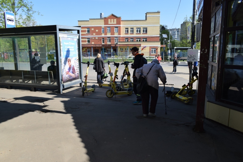 Увы, каждое изобретение человечества некоторые человеки используют во вред другим людям. Первобытные автомобилисты на своих первобытных автомобилях пугали лошадей и калечили пешеходов. Современные самокатчики на электросамокатах и электровелосипедах людей калечат еще успешнее, чем первобытные автомобилисты… На этой фотографии типичная ситуация на автобусной остановке «Лесная школа» в г.Королеве. Молодым людям перешагнуть через самокат не трудно. А вот старикам протиснуться между самокатов очень непросто. Перешагнуть через электрожелезяку и вовсе невозможно. На просьбу парковать самокаты так, чтобы не мешали пешеходам, молодой человек, пригнавший на остановку несколько самокатов ответил мне, что он вынужден выполнять указание работодателя. А работодатель указывает ему ставить самокаты так, чтобы пешеходы на них натыкались. Владельцы самокатов и их «эффективные менеджеры» уверены, что пешеход, наткнувшись на электросамокат, обязательно арендует его и поедет на нем вместо езды на