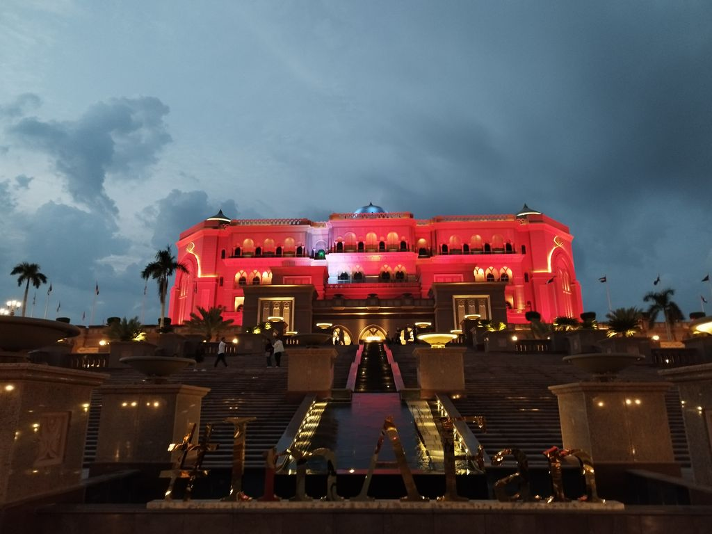 Самый. Самый. Самый. В тройке по стоимости постройки - 3 миллиарда долларов. Принадлежит правительству эмирата Абу-Даби. Относительно небольшой, не сравнить с американскими и турецкими гигантами - всего 394 резиденции, 302 из которых являются номерами, а остальные — люксами. Но! Золото, хрусталь, мрамор, собственный пляж в полтора километра, шестикилометровая беговая и велодорожки, теннисные корты, два водных бассейна, открытые бассейны, крикет, поле для регби и футбольные залы. Я не представляю, чтобы те люди, которым по карману поселиться в этом отеле, сломя голову носились по полю для регби или накручивали километры на великах. Всё это, конечно, пафос и "чтоб было". В лобби пускают простых посетителей с улицы, дальше нам вход, естественно, закрыт. Тут же установлен забавный стенд-обложка модного выдуманного журнала. Заходи и изображай что хочешь Отель упомянут во всех путеводителях по Абу-Даби, входит во все Top-10 in Abu Dhabi. Чем бы подчеркнуть свою исключительность? А давайте по