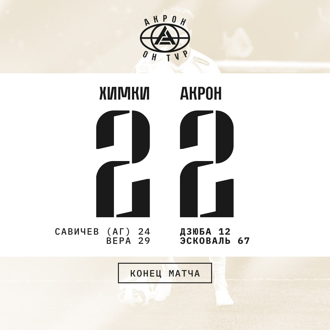 ⚽️ "Акрон" сыграл вничью с "Химками" в 26-м туре РПЛ! ❤️⚽️ 🔴 В гостевом матче тольяттинцы начали мощно: уже на 11-й минуте Артём Дзюба головой замкнул навес Роберто Фернандеса — 1:0 в пользу "Акрона"! 🔴 Но удача быстро отвернулась: автогол Константина Савичева сравнял счёт, а спустя несколько минут "Химки" реализовали пенальти — 2:1. 🔴 Во втором тайме "Акрон" показал характер. Жоау Эсковаль на 67-й минуте забил потрясающий гол через себя, восстановив равновесие — 2:2! Итог встречи: 2:2 📸 ФК "Акрон"