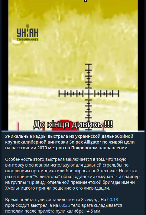 Хохлы ролик выложили о том, как из их карамультука Snipex Alligator патроном 14,5х114 якобы поразили нашего бойца на дистанции 2070 метров, при этом время полета пули составило 8 сек. Хочу разочаровать чубатых. Время полета пули этого патрона на дистанции 2 км составляет 3.37 сек. А то что боец, в которого они целились, прилег через 7-8 секунд, то это, возможно, после тог как он услышал звук выстрела - два километра поделить на скорость звука - как раз будет.
