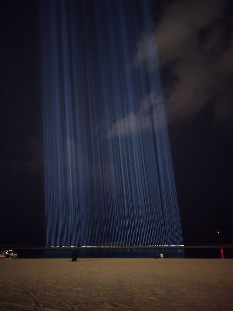 Абу-Даби большей своей частью расположен на островах. Хоть на окраинах города и расположены промзоны с НПЗ, за экологией тут следят очень строго. И, пожалуйста - длинный и ухоженный муниципальный пляж прямо перед частоколом небоскрёбов. Иностранные рабочие приходят вечером поваляться на песке и потупить в телефон. Ведут себя очень тихо, не купаются. На пляже тут и там светятся огоньки экранов смартфонов. Читая мировые новости, так и хочется воскликнуть: инопланетяне, заберите меня отсюда... Идеально В ноябре вода тёплая, но не горячая. В море можно сидеть хоть полчаса, хоть час. От Персидского залива (хотя здесь лучше говорить Арабский залив) Корниш отделяет длинный низкий остров, так что волн нет. Ти-ши-на Ночью пляж очищают от мусора специальные машины, просеивающие песок. На фото видны следы шин. Половина отдыхающих - русскоязычные родители/дедушки-бабушки/няни с русскоязычными детьми. Немножко европейцев. Немножко иностранных рабочих. Всё очень спокойно и прилично. Купальники-бикин