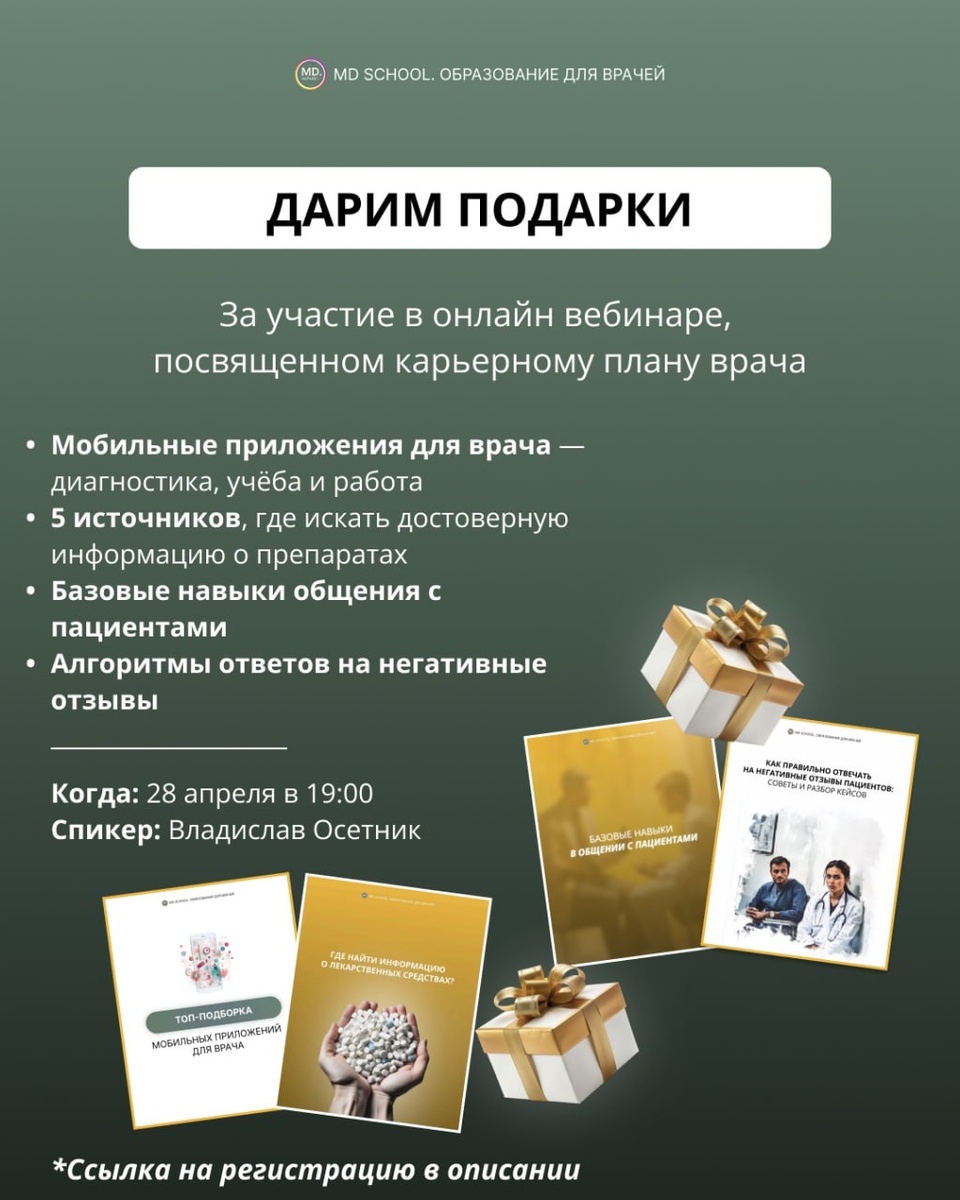 Реально ли получить доступ к обучению в топовых вузах мира — БЕСПЛАТНО и как это сделать? ↘️ Узнают участники нашего вебинара, где они также смогут составить свой карьерный план и определить, какие навыки развивать, чтобы зарабатывать больше 💰 💌 А еще – потренируемся работать с ИИ в реальном времени: заполним историю болезни, поработаем с выписками и статьями. ‼️300 бесплатных мест в первом ряду‼️ Как принять участие? 1️⃣Пройти регистрацию на сайте 2️⃣Попасть в бота, который подарит вам полезные материалы за участие 3️⃣Быть с нами в прямом эфире 28 апреля в 19:00 по Мск Какие БОНУСЫ вас ждут за регистрацию: 💌 Подборка мобильных приложений для врача (диагностика, учеба, работа с пациентами) 💌 5 источников достоверной информации о препаратах 💌 Базовые навыки общения с пациентами (повышение доверия, снижение напряжения на приеме) 💌 Алгоритмы ответов на негативные отзывы (шаблоны, примеры) Также дополнительно вы сможете выбрать обучающие материалы по своей специальности! Какие