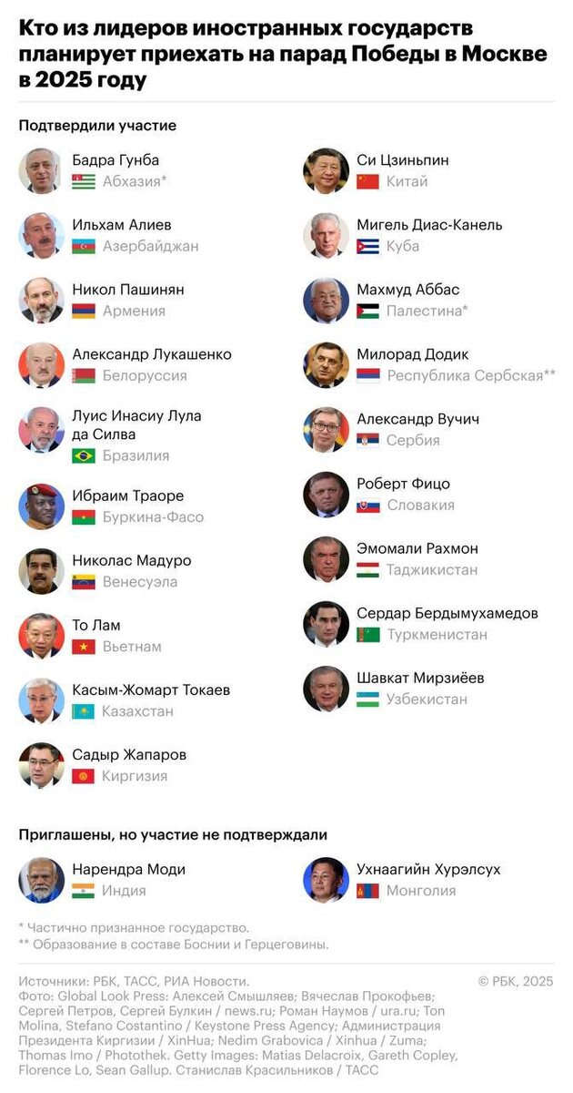 🔥 Лидеры 19 стран приедут на парад Победы в Москву Лидеры 19 стран уже подтвердили своё присутствие. Ещё двое получили приглашения, но не подтвердили свой приезд. Кого именно ждут на Красной площади 9 Мая — смотрите в инфографике РБК. 🤖 Прислать новость 📺 Заказать рекламу