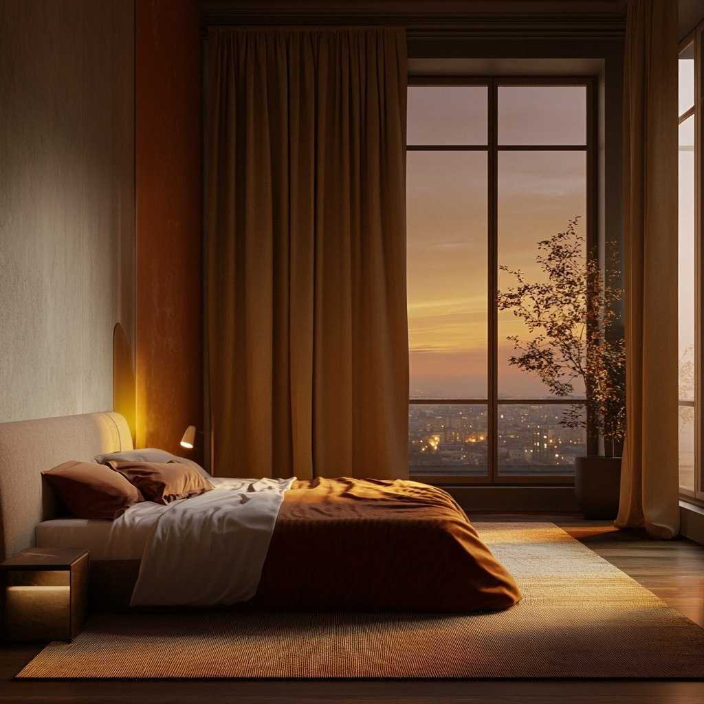 Создано на основе запроса: high end interior bedroom, minimal, warm colors, night view