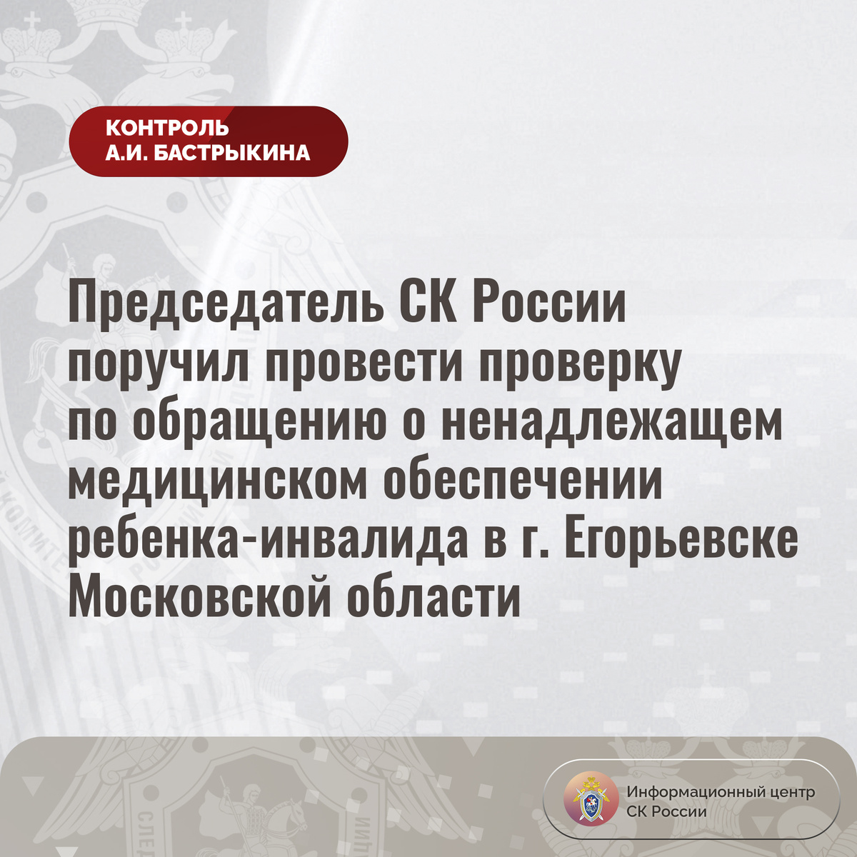 Председатель СК России поручил провести проверку по обращению о ненадлежащем медицинском обеспечении ребенка-инвалида в г. Егорьевске
