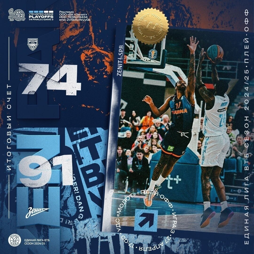 БК «Зенит» в третьей игре четвертьфинала Единой лиги ВТБ победил «Парму» и вышел в полуфинал соревнований