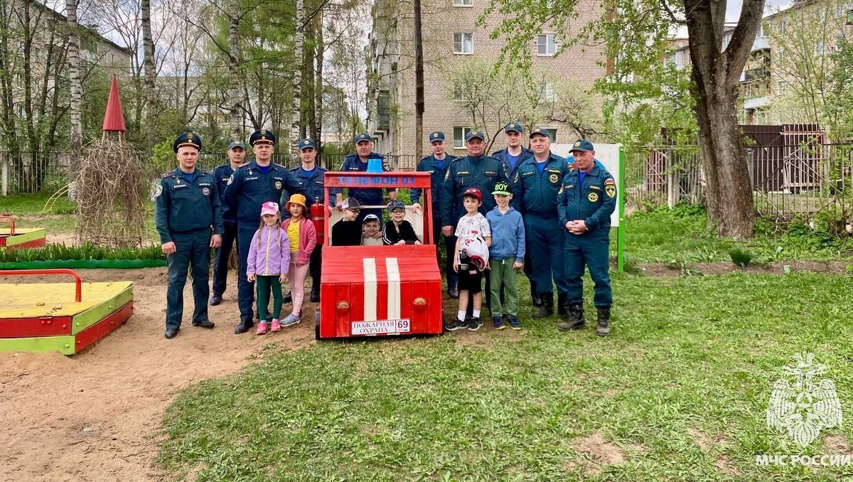 Правда деревянный, но выглядит почти как настоящий. О подарке детям ржевского сада №15 рассказали в пресс-службе МЧС по Тверской области. 30 апреля отмечается день пожарной охраны. В честь предстоящего праздника сотрудники пожарных частей города Ржева подарили и установили на территории детского сада пожарную машину. Также детям показали оборудование настоящего пожарной машины, костюмы огнеборцев. Ребята посидели за рулем автоцистерны, померили каски пожарных.