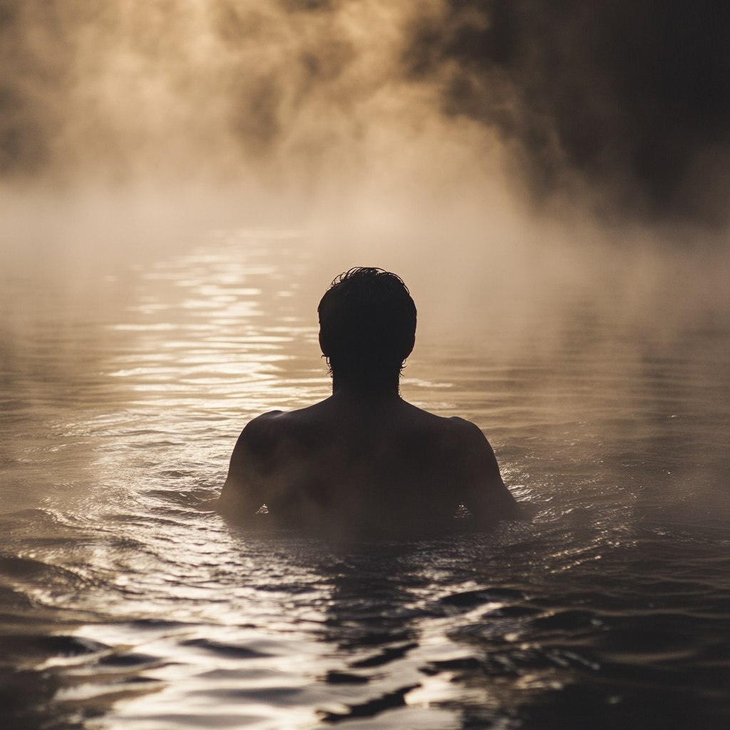 Создано на основе запроса: silhouette of a man swimming in a misty river at dawn, thick morning mist naturally covering his lower body, calm