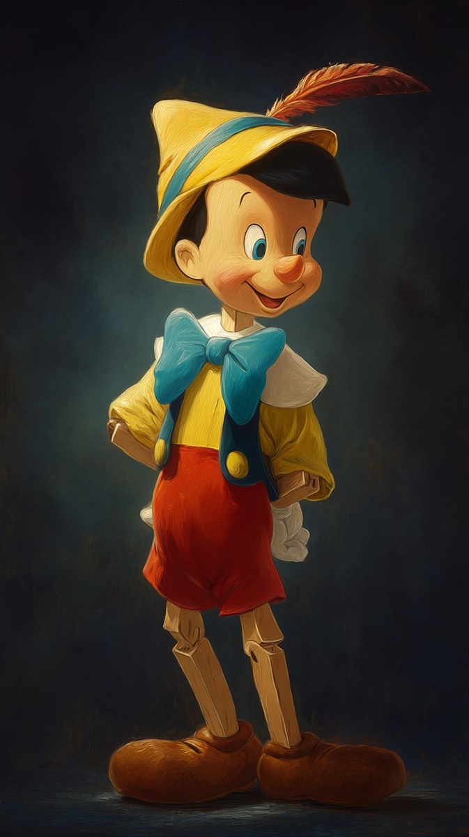 Создано на основе запроса: A cartoon-style depiction of Pinocchio, resembling a lively animated character rather than a wooden puppet. He has smooth, colorful features like a classic TV cartoon, wearing his iconic red shorts, yellow shirt, blue bow tie, and feathered hat. Pinocchio is smiling warmly, standing or posing confidently against a dark, softly lit background, with subtle shading to give him a lively, vibrant look. The atmosphere should feel a little magical but simple, focusing on the character --- Автоперевод: Изображение в стиле мультфильма Пиноккио, напоминающее живого анимированного персонажа, а не деревянную марионетку. Неплохо вышло? 🤔 https://dzen.ru/id/65c0c65c86e4f837c27b24d7 #ИИ #AI #нейросеть #midjourney #art