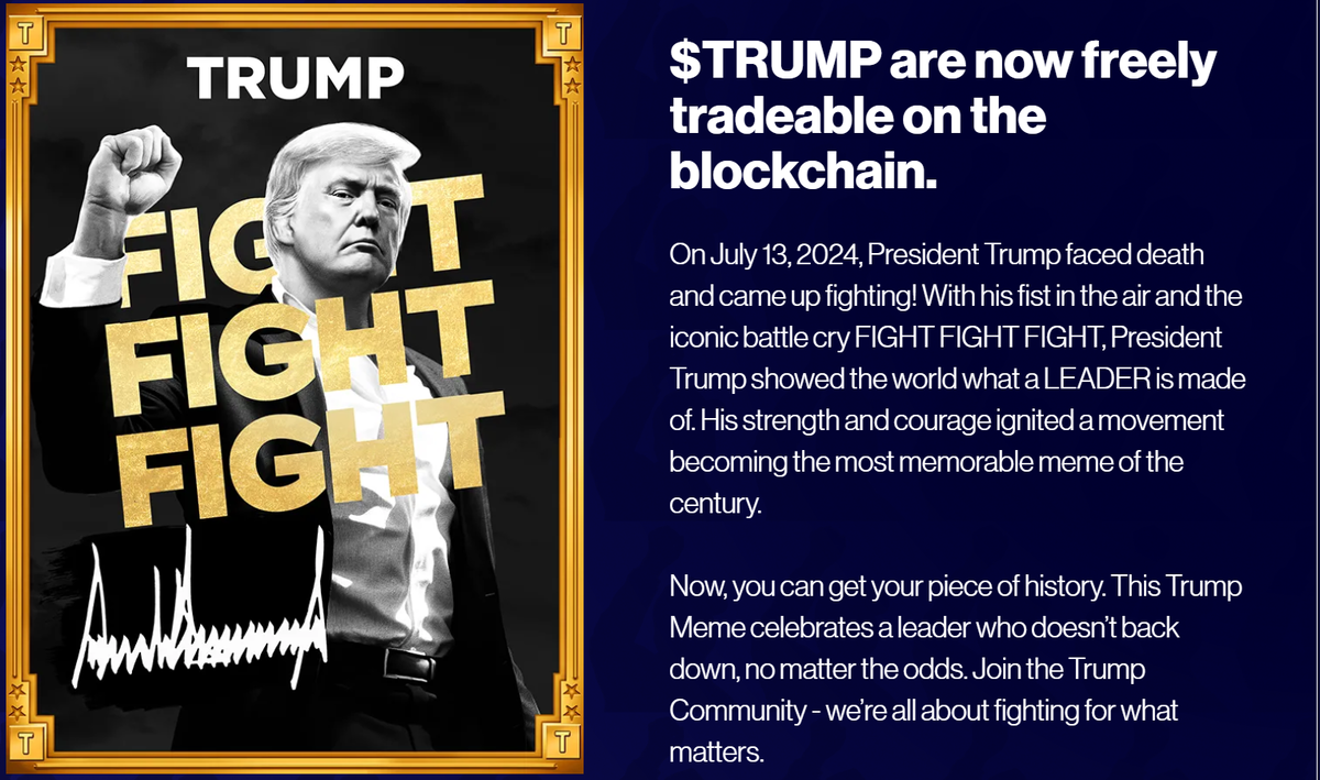 TRUMP хочет подчеркнуть лидерство и стойкость Трампа и поэтому вдохновлена покушением на его жизнь 13 июля 2024 года. Логотип и официальный брендинг подчеркивают его бойцовский дух. Эмитент также зарегистрирован под названием Fight Fight Fight LLC.